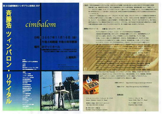名古屋電気文化会館でのリサイタルでは、作曲家の西村朗氏によって書かれた新作「ツィンバロンのための伝説曲」を世界初演。このリサイタルはサントリー芸術財団の推薦コンサートとなりました。